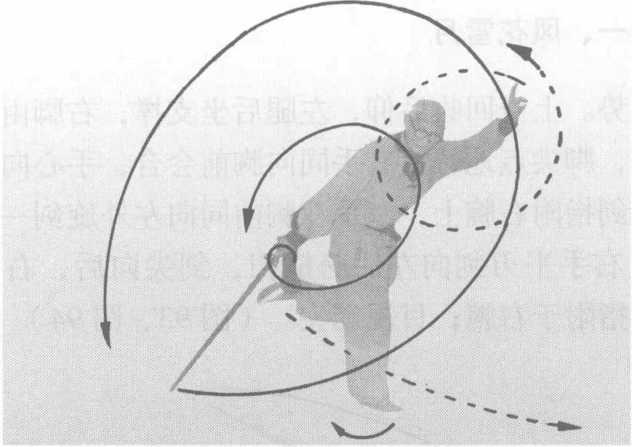 接上势。上身回收后仰,左腿后坐支撑,右脚由前回拉停 于左脚前,脚尖点地;左右手同向胸前会合,手心向下,剑尖 向前;左剑指附右腕上,双手在胸前同向左外旋剑一周;变手 心向上;右手平刃剑向左后胯横扫,剑尖向后,右手停于左 胯,左剑指附于右腕;目视剑尖。(图93、图94)