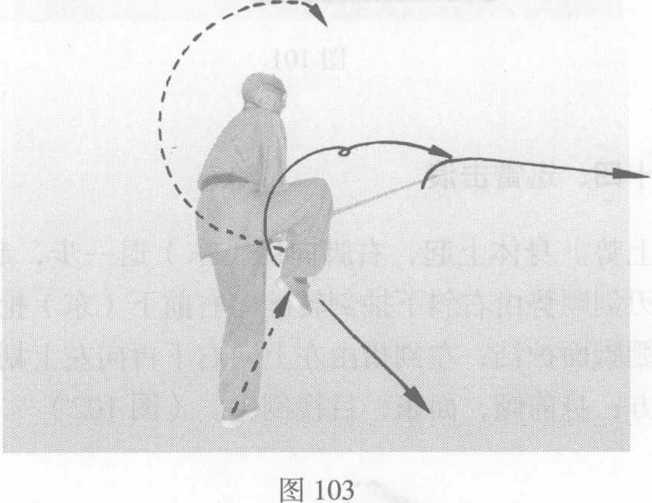 接上势。左脚向左(西)下落站稳,右脚提起,绷脚面 护裆;双手分别向两侧下划弧,右手抽剑至左胯,剑尖斜 上,如同勒马状;左剑指附于右腕;身向东,目视剑尖。 (图 103 )