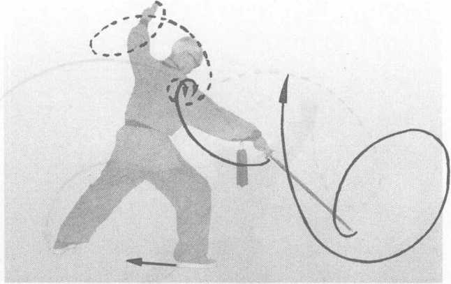 身向西,左腿坐步,蓄力做好腾空转体准备,右腿屈膝提 起,准备扬甩腾空;与右手剑同起动,右手剑由右后(东),向 左上旋剑迅速转身;右脚趁势甩腿上扬,带动左腿爆发腾空, 迅速向右转身;右剑随之迅速上旋,趁转身下落时向下用力抡 劈,转身落地时左手随之向下划圆甩剑指,停于头左上;目视 剑尖。(图217)此式看似简单,但须原地转身、腾空、即过去所说的: “旱地拔葱”的另一种称法。图217