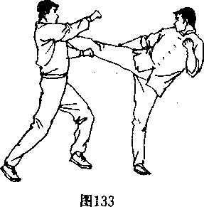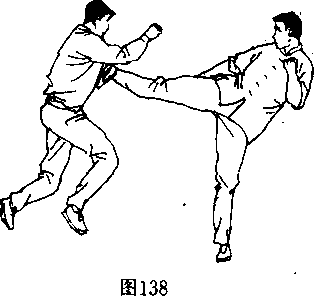 攻击(图136〉,同时迅速提起右脚(图137〉,呼气发力将右脚 猛力攻向对產:趙,中盘调138〉。