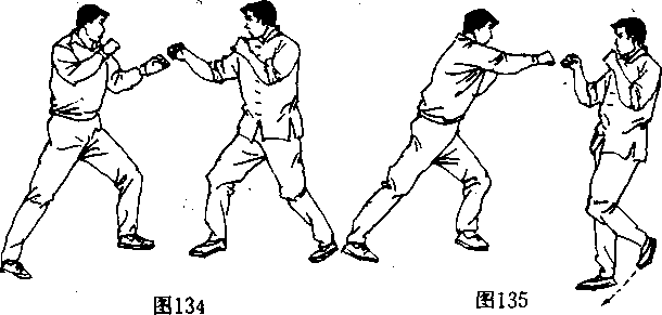 [动作要领]由戒备势开始(图134〉,当对手发起攻击时, 李小龙左脚向左方移动到恰当的位置(图135〕,避开对手的