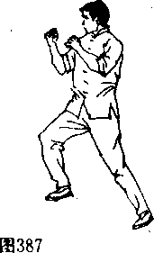 图388图388图389图389[动作要领]对手欲 用前腿疼来时,(图 387〉,李小充用右肘砸 抱住对手膝关节,并用 右低扫踢腿猛攻对手的 支撑腿膝关节或踝关节 (图 388、389〉。