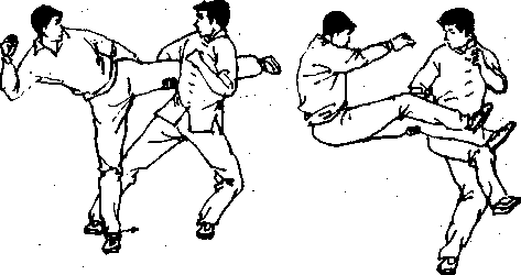 时应是劲力爆发焦点,扫踢追打,必须腰马合一,应适当迫近 对手,始可为攻。