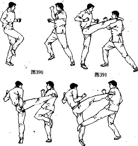 [动作要领]对手右脚向中盘踢来时(图390〉,李小龙用 左臂予以格挡(图391、使其腿击偏离攻击路线,迅速抬起左 脚(图392〉,勾踢腿击对手支撑腿的踝关节(图393;!。