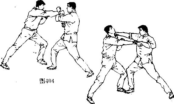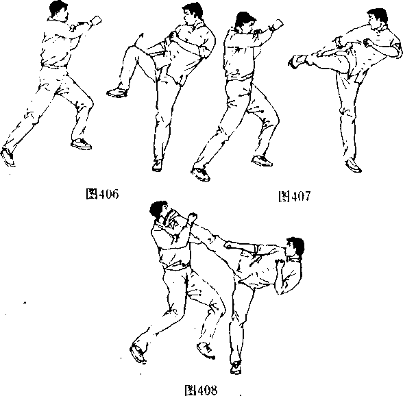 [动作要领]对手挥有拳向上盘攻来时,李小龙用左手挡 开对手攻击的同时(图404〉,右拳早已打到了对手的面部(图 405〕,在右手回收的同时,迅速抬起右脚(图406;!,用右侧踹 重创对手中盘(图