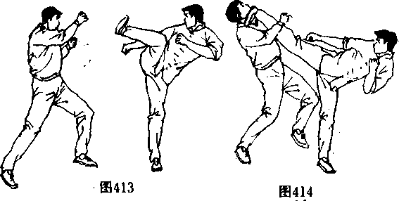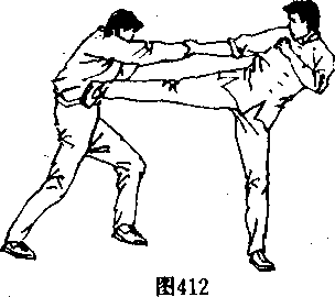 并反手抓住对手手腕(图409〉,接着,抬起右脚(图410〉,用侧 踹腿击中对手的中盘X图411、412〉,右脚略回收(图4130,攻 出一记高侧踹腿重创对手上盘(图414〉。 ’