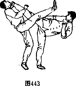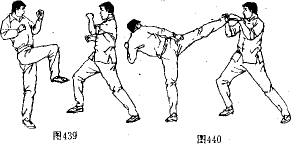 [动作要领]对手起右脚向面部攻来时(图439〉,李小龙 速用右手拍防(图44〇〉,使其右脚偏离攻击方向,接着,李小 龙迅速抬起了右脚(图441〉,随着口中的吼叫声将右脚猛力 辱出(图44约,重创对手的上盘(图443〕。~ …
