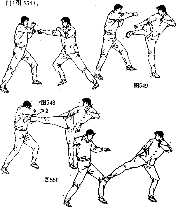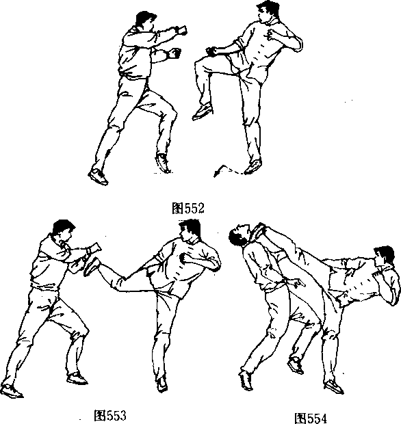垫步迫近对手(图552〕,再将前述腿法重复一次。第三次他又 提起腿来(图55幻,对手本能地提膝躲闪,但这一脚却直奔面
