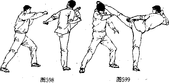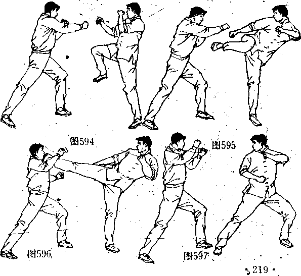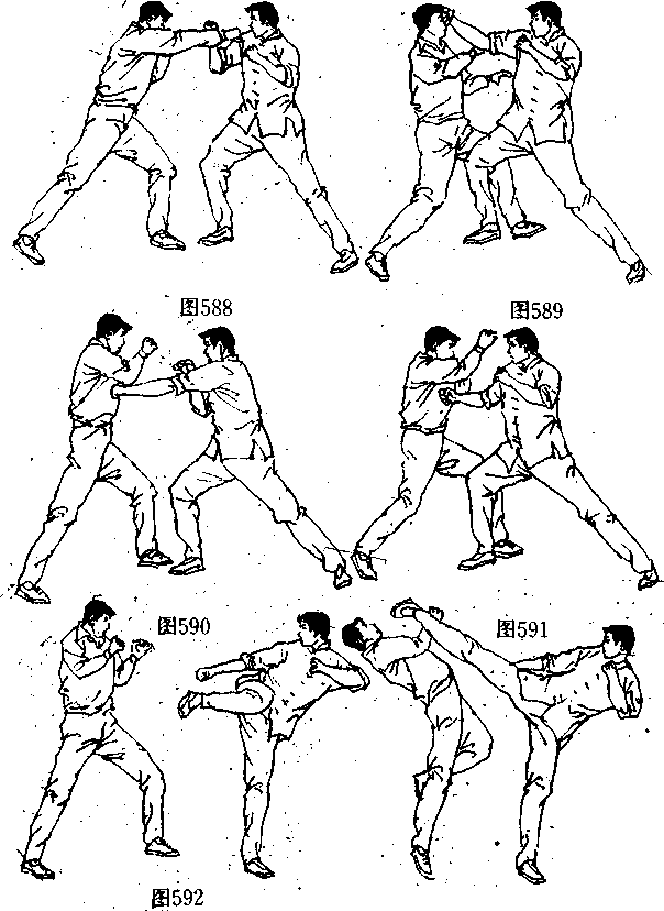 [动作要领]李小龙先故意暴露出头部诱敌攻来,当对手 果真攻出右拳时,李小龙速用右臂格挡(图588〉,同时身体重 心前移,右拳抖腕用拳背重去对手头部(图再用左短直 拳猛击对手心脏(图590〕,进右步用右拳猛击对手的中盘(图' 591〕,迅速将左脚前垫一步并抬起(图592〉,将右脚狠狠踹出 (图 593;!。