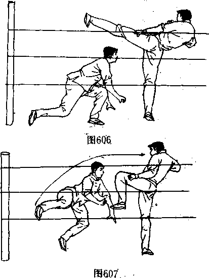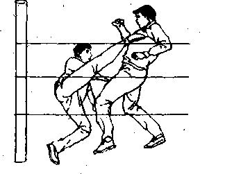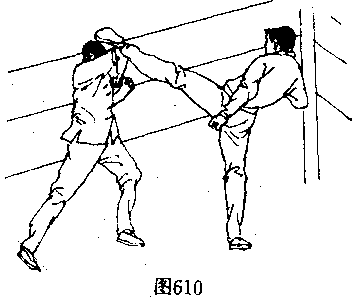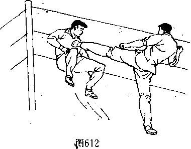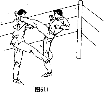 手、臂向前,向上猛力 推搡、撞击对手的左 腿部(图610〉,使其 身体重心升高上体后 仰,接着,右腿及时配 合,用下段横扫踢腿 对准对手的右支撑腿小腿后下部,向自己身体左内侧方向用 力勾扫(图611〉,使对手凌空飞出,在对手身体落地前的、瞬 间,迅速追加一记侧踹腿重击对手胸部(图6.12〕,将其踢伤或 踢倒在前侧的护绳上。