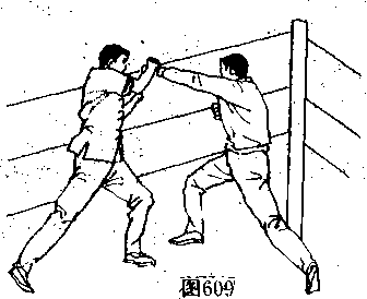 [动作要领]李小龙被逼至绳索的中央部位时,可速抬有 臂挡开对手的左拳重击(图609〉,对手又提左脚连续攻来,李[动作要领]李小龙被逼至绳索的中央部位时,可速抬有 臂挡开对手的左拳重击(图609〉,对手又提左脚连续攻来,李(三)退至绳索中央的反击法 ―