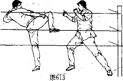 [动作要领]当对手退在比赛场台边绳附近,并借助绳索, 突然施用左横扫腿向李小龙头部踢来时(图613〉,李小龙闪