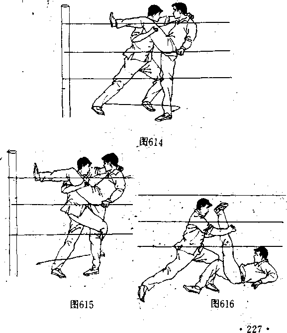 侧支撑腿(图615〕,直至其仰面倒地,趁势跟随其前倒,用右 肘击砸对手头部或咽喉部位,(图617〉。 ’