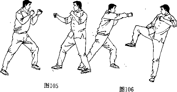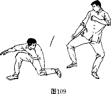 一声用力拧腰调髓将右腿由屈到伸斜身踢击对手膝关节(图1犯八令其膝关节脱臼或髓骨碎裂瘫倒在地(图109兀