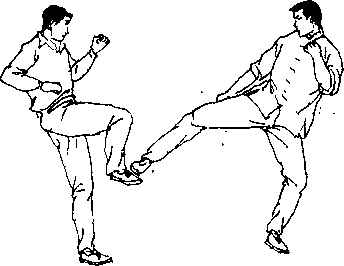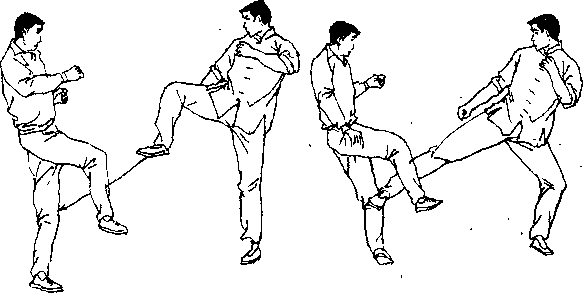 动作要领由戒备势开始对手抬右腿攻来(图11。)李小龙前手上挥迷惑对手同时抬右脚对其膝关节踢击(图111、112),同腿不落地略回收后(图113),连续攻击对手支撑腿膝关节(图114八 一