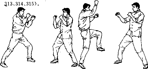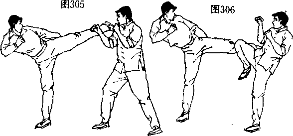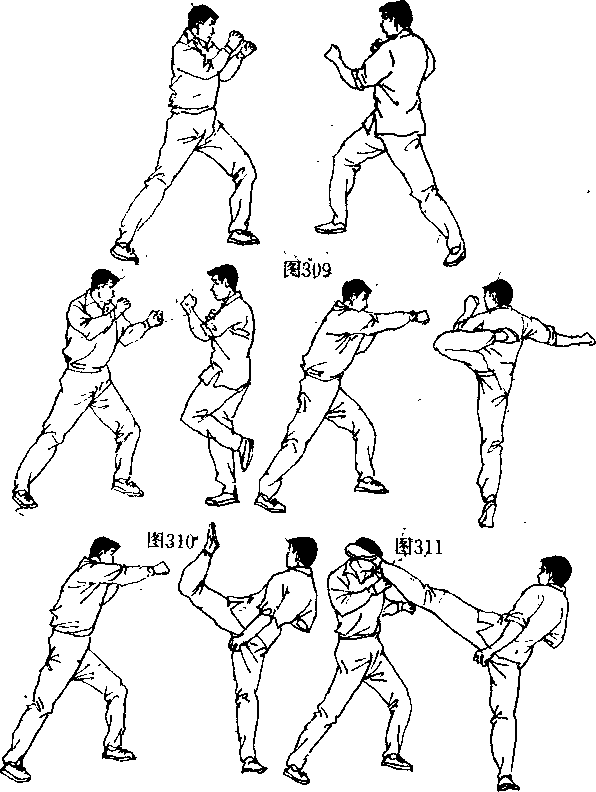 动作要领由戒备势开始(图305),对手抬起前腿向李小龙攻来(图306),李小龙向左转体防御(图3。7),同时抬起右膝由里向外猛摆撞击对手膝关节或胫骨(图308),迅速落稳右脚(图309),用左扫踢随重例其上盘(图313132