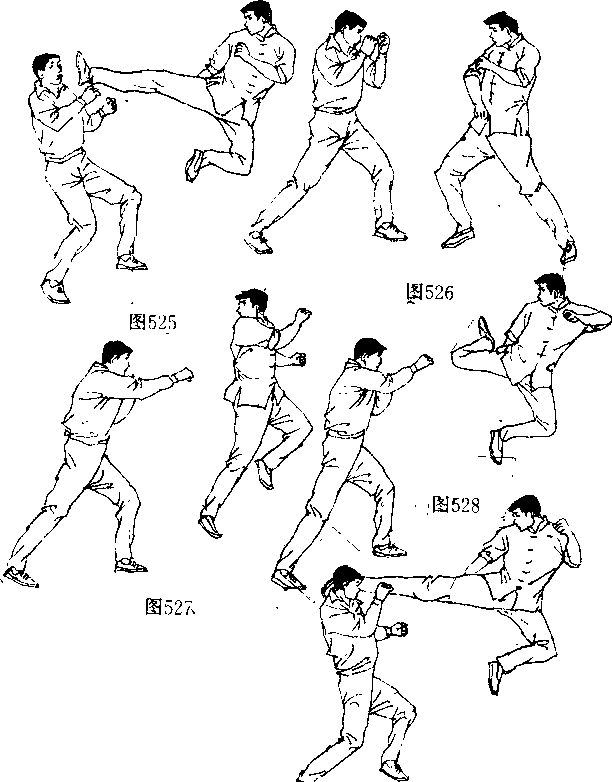 动作要领李小龙前手虚晃一招接着抬起右脚(图521),用侧踹腿重创对手中盘(图522),将其迫退又抓住战机腾空跃起(图523),用右正踹(或扫踢)猛击对手头、面部(图524、525),迅速落稳双脚(图526),猛然向左后方转体360%腾空跃起(图527、528)用右扫踢腿重击时手头部(图529)图必