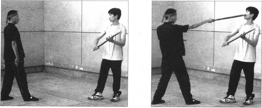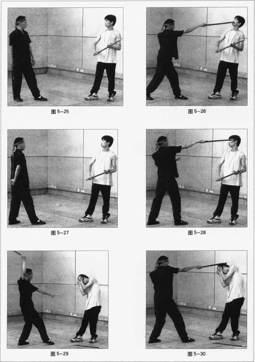 无任何预兆,以“迅雷不及掩耳”之势,突然对敌发起攻击。应该注意的是自然 站立,神态松弛,不显示搏斗迹象,突然攻击往往令敌人防不胜防,其命中率高,效 果显著。阳手前垂藏棍势突然攻击(图5-23?24)阳手后垂藏棍势突然攻击(图5-25~26)阳手背藏棍势突然攻击(图5-27~30)阴手藏棍势突然攻击(图5-31?32)图 5-23 图 5-24图 5—31图 5-32