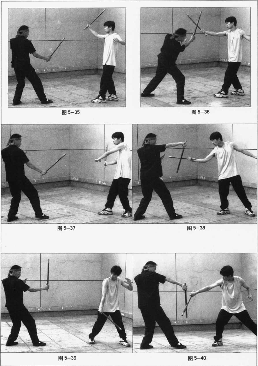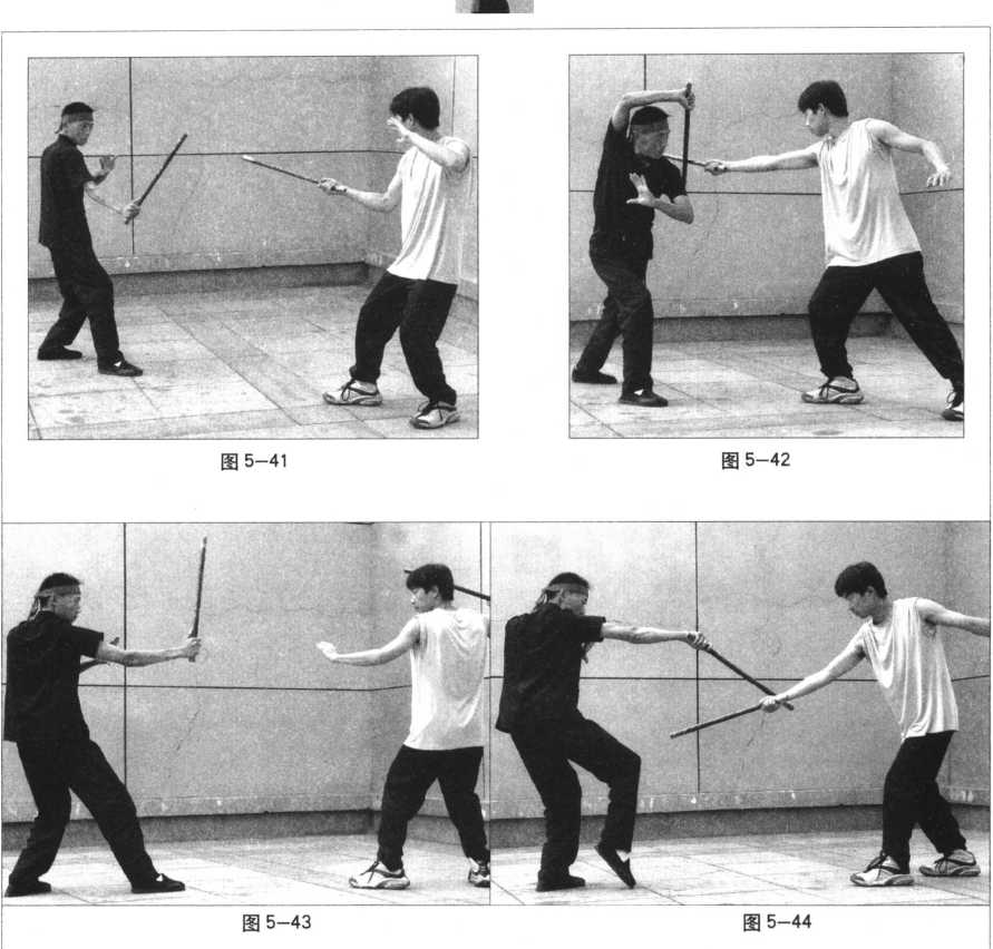 防上盘正劈 防上盘斜劈 防中盘横扫 防中盘撩击 防中盘刺击 防下盘扫击(图 5—33 ~ 34) (图 5—35 ~ 36) (E 5-37-38) (图 5-39~40) (图 5—41 ~42) (图 5—43 — 44)图 5—33图 5—34