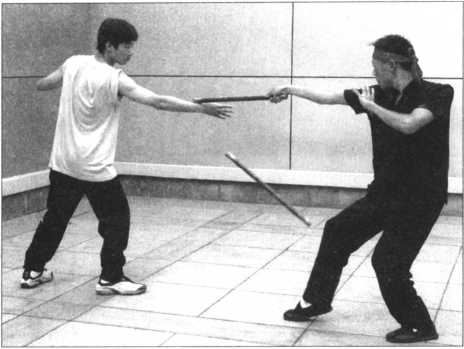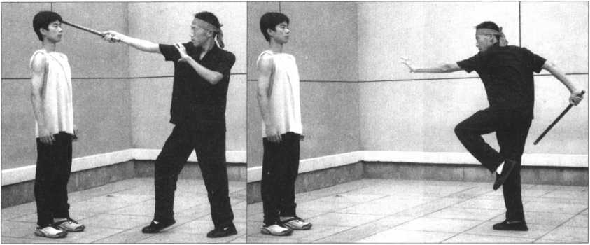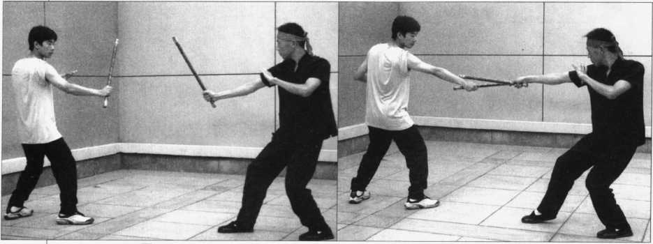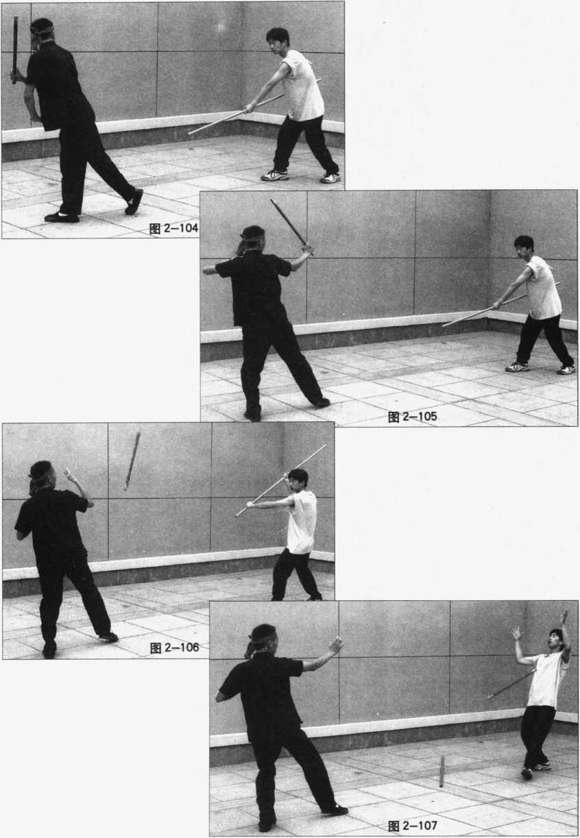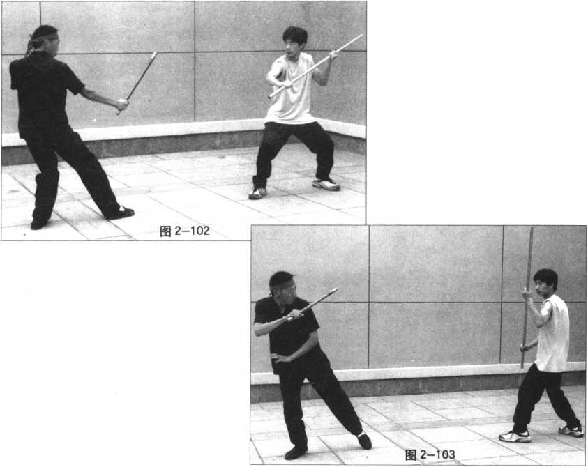22 .点腕棍(图2-99?101)是用棍头做轻快点击敌人腕部的棍法。