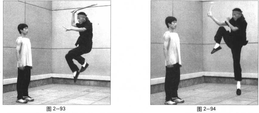 (图2-91 ~95)借助腾空之身势,由上向左下斜行劈击的棍法。