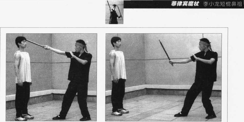 23.脱棍(图2-102~107)是传统菲律宾武术中的一种特殊技法,可远距离 杀伤敌人。其运行方式为旋转飞行。具有速度快、杀伤力大、防不胜防的特点。但是, 在现代菲律宾魔杖全接触比赛中被禁止使用。