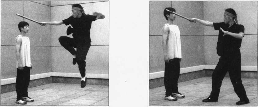 20 .腾空反劈棍(图2-96~98)借助腾空之身势,由上向右下斜行反劈的棍法。