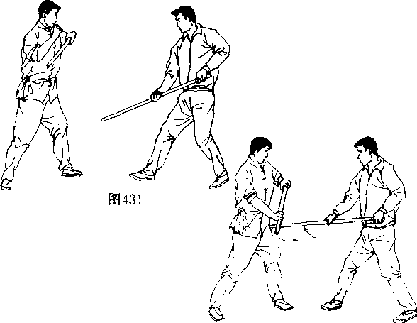 (2)对手出棍挑击己方下体,持棍压截防护。(图432)