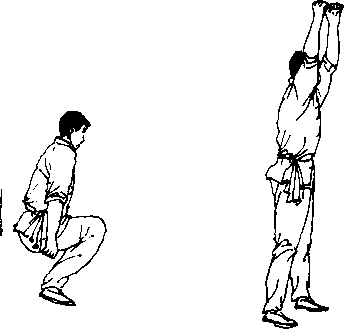 由自然姿势开始,双臂平举,双脚分开,屈膝下蹲同时,双 臂自然下摆,随即双脚并拢起立同时双臂上举,做连续动作练 习。(图 38.39)