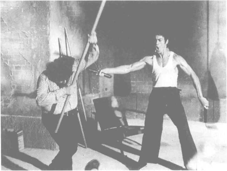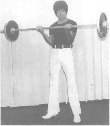 当李小龙在香港九龙塘家中将马西牌循环训练器安装好之后,他最喜 欢的一种练习就是站姿拉力器弯举。在这种方法中使用低滑轮的好处是能 够在整个动作过程中向肱二头肌持续不断地施加抗阻力。而在使用杠铃或 哑铃练习时,肱二头肌所承受的有效抗力是会变化的,并且感受非常明显, 其原因在于杠杆作用中的力量变化(从动作开始时的零抗力,不断变化至 杠铃降到肩膀时再次产生的零抗力)。这一练习主要锻炼肱二头肌,附带锻