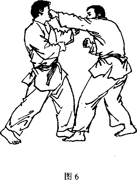 (1) 敌我实搏,敌忽然进步以左直拳向我头部攻来,我后 闪防守,待敌回收左拳的瞬间,即以左直拳反击敌面(图5、 6)o