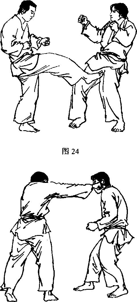 (1) 敌我对峙,我迅速以右弹踢攻敌裆部,敌中招迟滞, 我迅速用右拳重创敌人头部,将其击倒(图24、25)o
