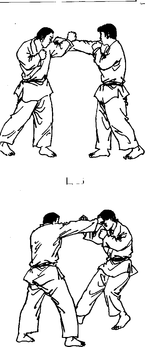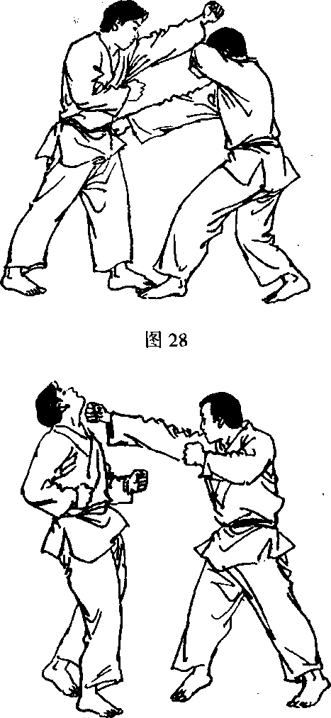 (2) 敌我对峙,敌以右直拳攻我面部,我迅速用左臂向外 格挡,同时用右直拳重摧敌人头部(图26、27)。