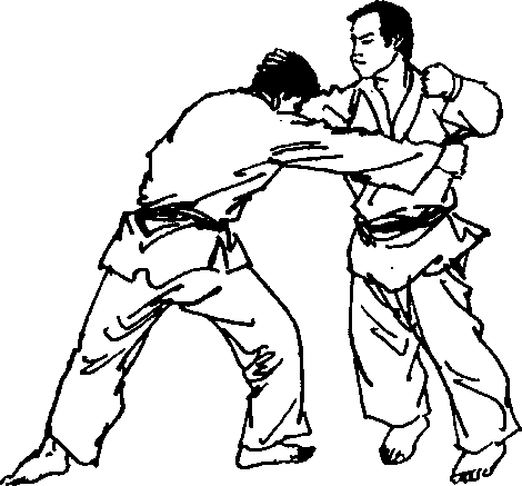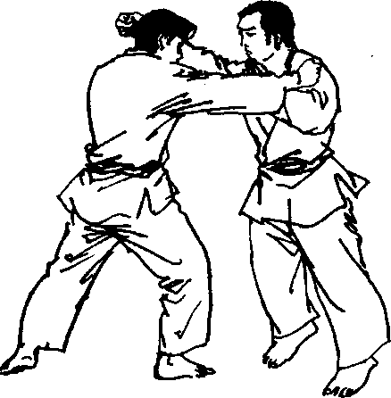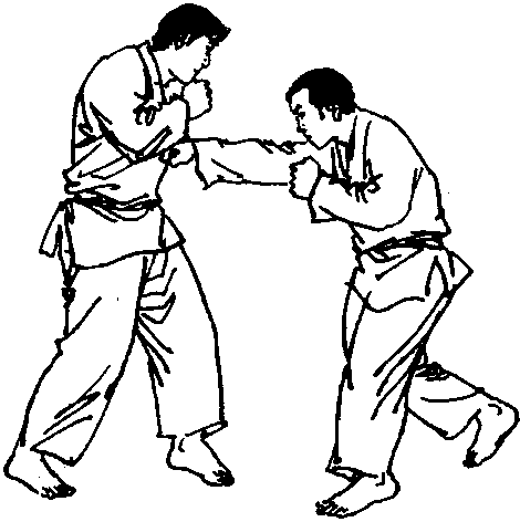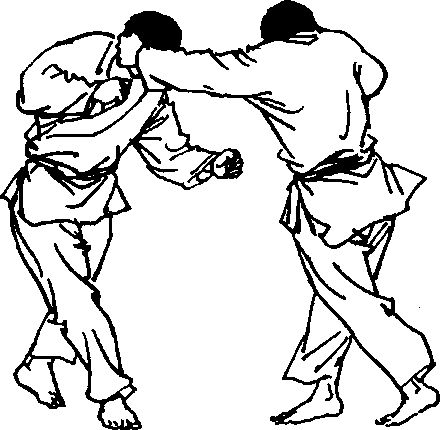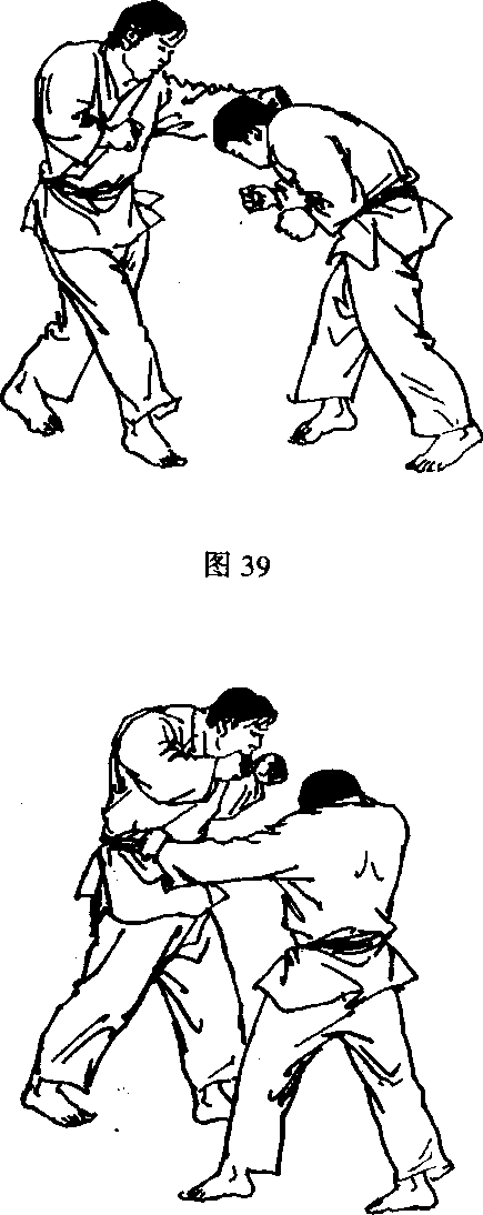 (2) 敌我对峙,当敌向前以右直拳向我上段击来时,我以 左手拨挡其右前臂,同时略将身侧右转,并以右手前伸绕过敌 后颈随即变为攀颈手,将对手后拉拖,使敌前俯,此时我以左 侧击拳重击其太阳穴部(图37、38)。