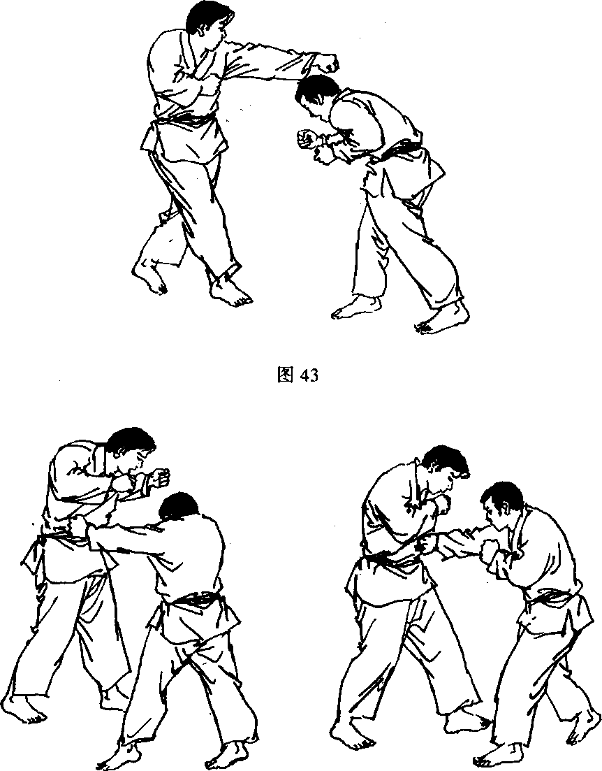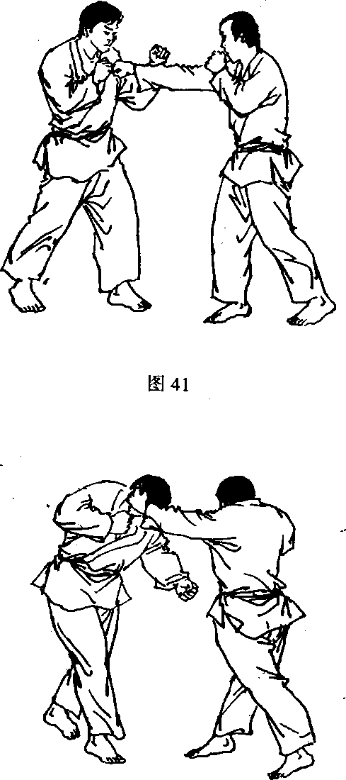 ,用左平 钩拳击打对手腹部(图39、40)。图42(3) 敌我对峙,我滑步以右直拳攻击敌面,趁敌以手相格 之机”即上步以左侧击拳攻击敌太阳穴(图41、42)。
