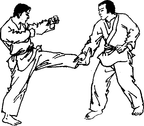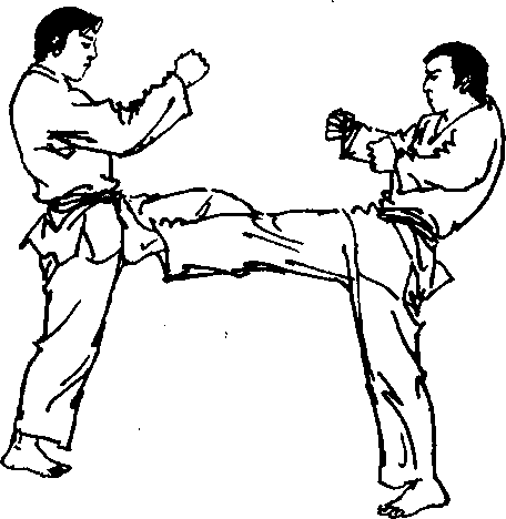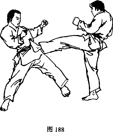我速抬右腿,屈膝向前上方阻 截,乘对方回收腿时,右脚不落地直接前蹬敌胸腹(图186)O?李小龙截拳道-图187(2) 敌用左正蹬腿攻我中段,我右掌向下拍击其小腿和脚 背,随即上步,用左蹬腿攻击其腹(图187、188)。图189(4) 敌以侧弹或侧踹攻我胸腹时,我用蹬腿截击其大腿或 腹部(图189)O