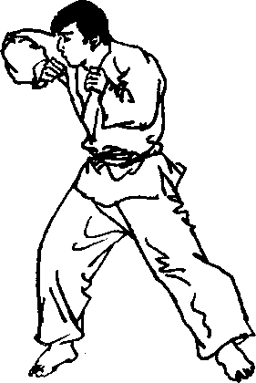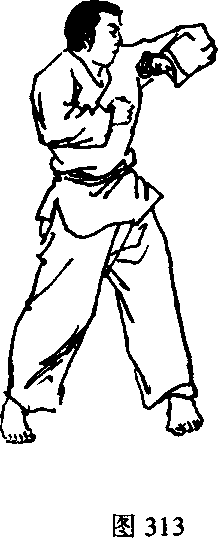 右逼肘:同左逼肘,惟方向相反。击完恢复戒备势(图 314)。