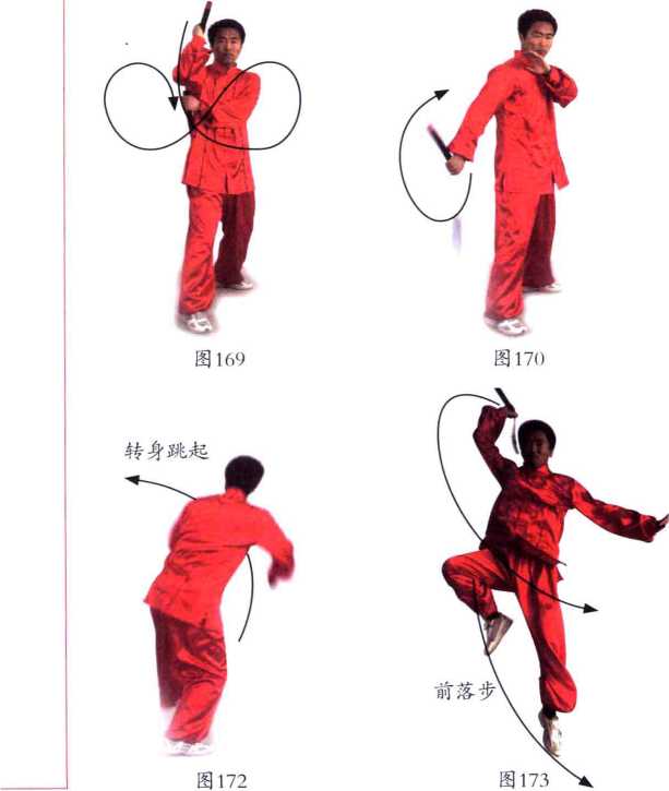抡棍,借身体下落之势向左腰侧劈棍(图169?174)。