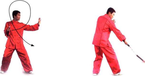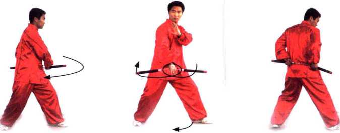 练為方法:由釜底抽薪势,右转身同时使棍围右手旋转1周,右手由正把握棍变成 反把握棍另一棍身;然后右手将棍扫向身后,右转身180° ,左手体后接棍成玉带横腰