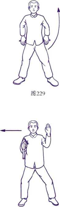 (2) 定位倒手:右脚向右侧开一步,同时双手各持一棍身呈双手擎天势,此时 步型为高马步,右手运棍在身体右侧横8字运棍,左手自然护于右肩前;然后右手扣 腕向身后带棍,同时左手于身后正把接棍;右手松开,左手带棍从下向上撩起,在身 体左侧横8字运棍,右手自然护于左肩前;接着左手带棍向右,右手体前接左手所握 之棍,并在体前画一立圆;最后右手将棍带于身体右侧,扣腕收棍成白蛇吐信势(图 227-232) 〇