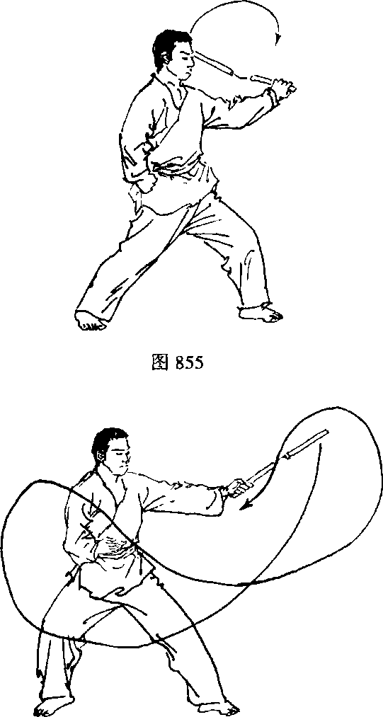 (2) 左手继续从左后上方经体前做8字形挥棍(图856)。