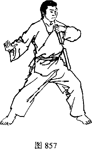 (3) 当棍到左上方时左臂外旋手心贴于腰间使棍向右下挥摆至腰后(图857)。