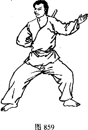 (2) 右脚向后移半步问时松开左手右手握棍端经体右侧向身右下方挥出(图859)。