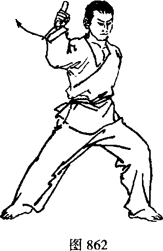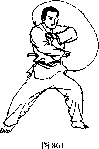 (3) 右臂外旋抬肘向上稍高于右肩然后右臂内旋用力翻腕向右腰下摆使棍从右下向右上再向右下经体前向左腰后绕行(图860)。