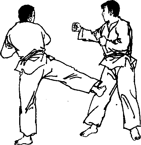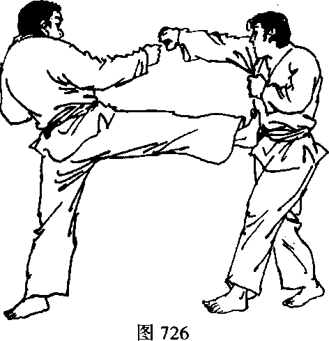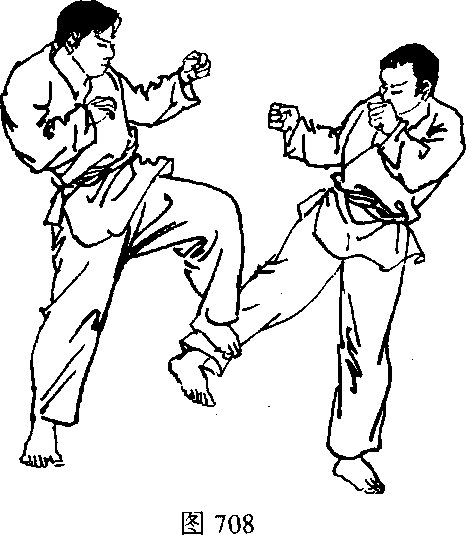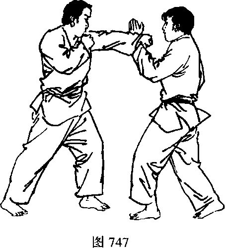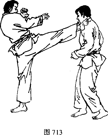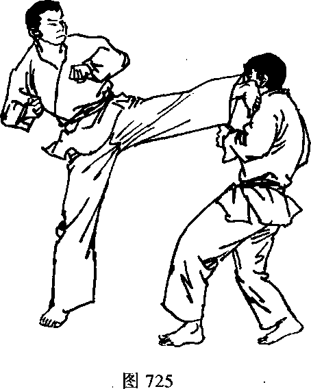 图553图556(10)敌我对峙我在拳法的掩护下忽然上步进身以前冲之势带动左腿低扫敌前腿膝关节、小腿如果对方退步躲避落左步时即以右脚猛蹬对方肋部(图555、556)。图560