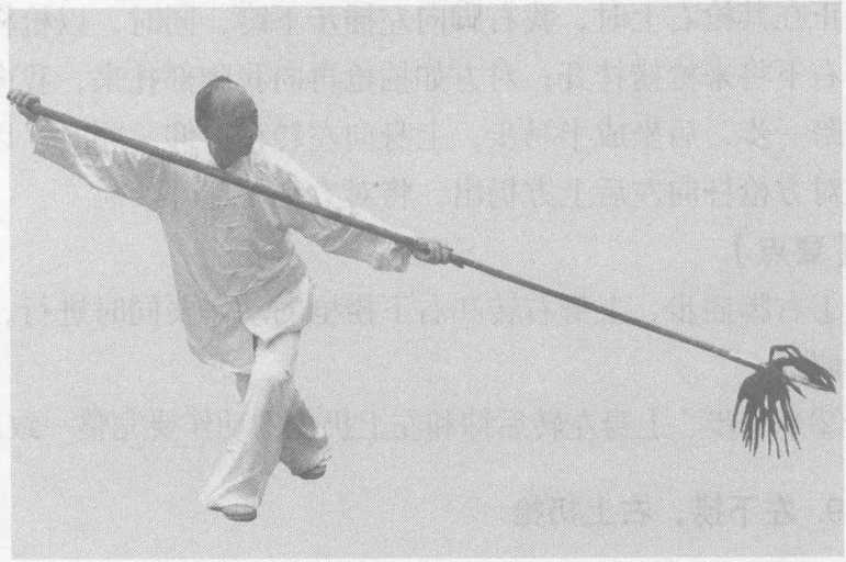 对方如向我腿部扎枪,我用枪向左后下方挂开;对方如抽 枪,我便不等其回势,向前上步进身,用枪杆前段向其面部摔 劈,必将对方连人带枪掷出。