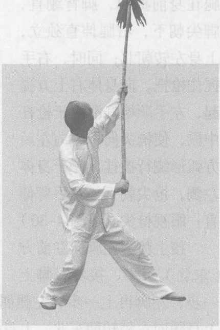 图 4-28图 4-28接上势。左脚向左前 方(正东)横跨一步,左 腿膝微屈,右腿屈膝半蹲 成半马步,上身左转朝东 北,稍后仰;同时,双手 握枪,向左后上方弧形扔 出,枪尖斜朝上,枪杆横 朝左;此时右手握住枪把, 屈肘停于腹前,左手移握 至枪杆中下段,手臂伸直, 手心朝上,停于头部左侧 前;眼视枪尖。(图4-29)