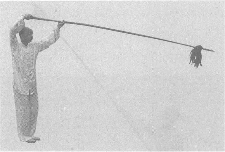 如对方向我胸、面部来枪,而我枪正在彼枪之下边时, 我向后撤步坐身,右手握住枪把下压,左手上托枪杆,用枪 杆前段向上崩挑其臂或腕部;对方如抽枪向后躲避,我随即 上步并脚,身体直立,顺势两臂伸直上举,以枪尖向其头、