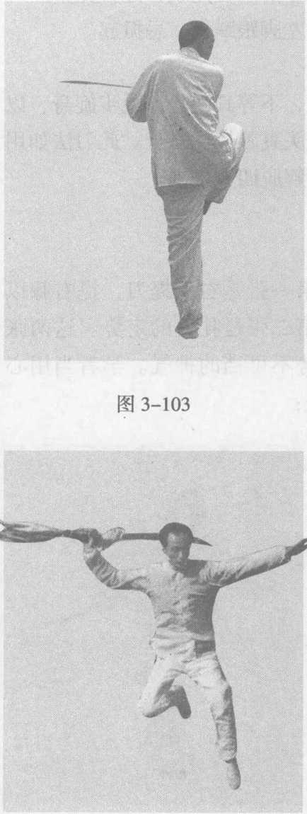 ① 左脚伸直站立,右腿在身前屈膝提起,脚背绷直,脚尖 朝下成左独立步;同时,右手持刀,手心翻朝下,刀尖朝后。 (图 3-103)