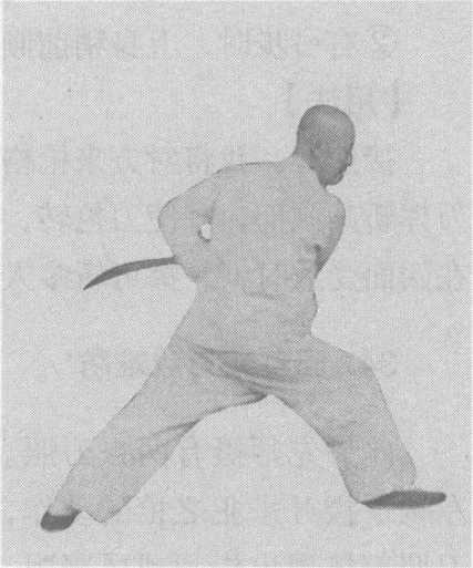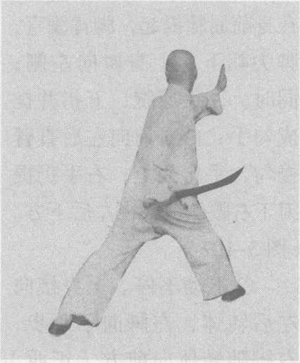 回,收于右腰侧,刀刃朝下,刀尖朝前;左手立掌,平胸向右 前方推出,头朝左转;眼视后方。(图3-104?图3-106)